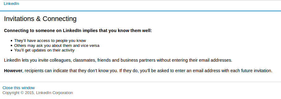 8 – f) (…) (a) using LinkedIn invitations to send messages to people who don’t know you or who are unlikely to recognize you as a known contact; (b) using LinkedIn to connect to people who don’t know you and (…)